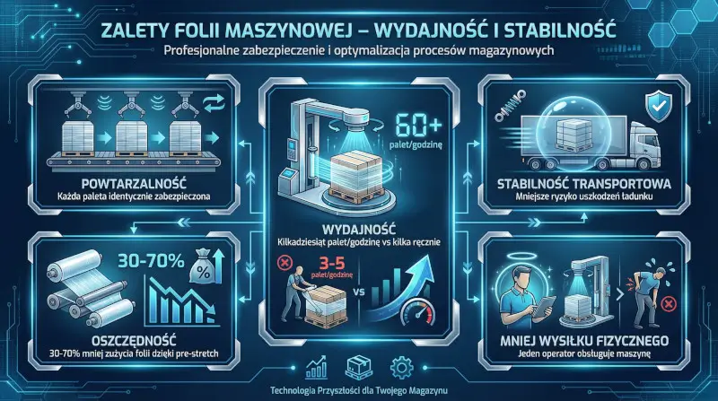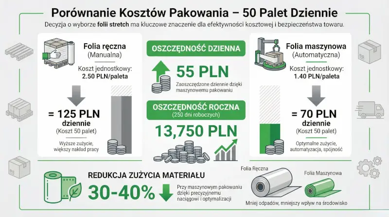 Gdy spojrzysz w liczby, różnice w kosztach pakowania palet stają się oczywiste. Owinięcie europalety folią ręczną kosztuje Cię średnio 2,00–2,50 zł netto, w zależności od potrzeb. Przy maszynie ten koszt spada do poziomu 1,30–1,50 zł, co pozwala na lepsze wybranie odpowiedniej folii stretch. Dzięki temu, że maszyna precyzyjnie naciąga materiał, możesz zużyć go o 30–40% mniej. Często folia maszynowa o grubości 12–15 mikronów trzyma tak samo dobrze, jak folia ręczna o grubości 23 mikronów.