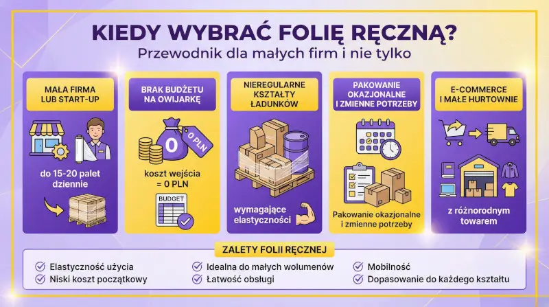 Warto rozważyć folię ręczną, gdy pakujesz kilka palet dziennie i masz bardzo różny kształt ładunku. Licz się jednak z tym, że takie owijanie męczy pracowników i zajmuje sporo czasu. Poza tym człowiek rzadko owinie paletę tak wysoko i tak mocno jak maszyna, co czasem osłabia stabilność podczas jazdy ciężarówką.