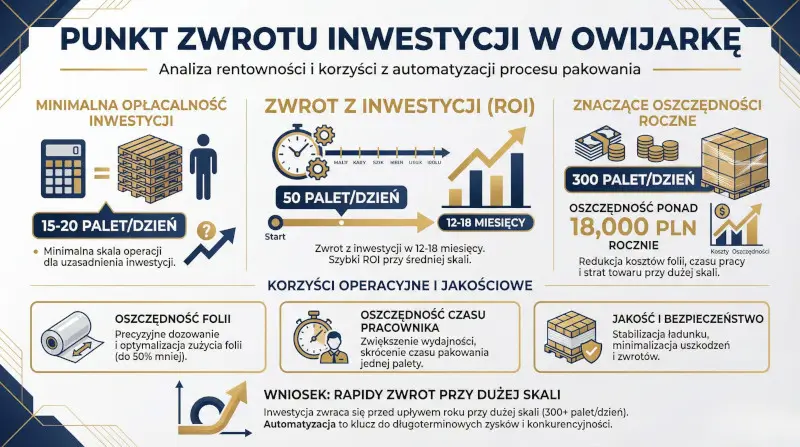 Przyjmuje się, że już przy ok. 15-20 paletach dziennie inwestycja w prostą owijarkę półautomatyczną zaczyna mieć sens ekonomiczny, biorąc pod uwagę oszczędność folii i czasu pracownika.