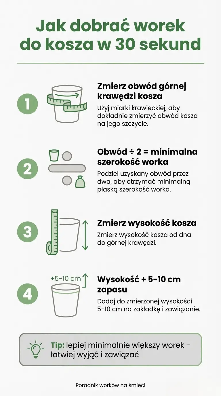 Mój sprawdzony sposób na wybór worka? Pora na szybki pomiar. Zmierz obwód góry kosza i podziel go przez dwa – to Twoja minimalna szerokość. Potem sprawdź wysokość i dodaj do niej 5–10 cm zapasu na zawiązanie góry. Lepiej, żeby worek był ciut większy od kubła, bo wtedy łatwiej go wyjąć bez siłowania się, co jest istotne przy Wybór worków na odpady to kluczowy element w zarządzaniu ilościami odpadów w domu.. Pamiętaj, że zbyt duży worek to po prostu marnowanie tworzywa, a zbyt mały zniszczy Ci humor już przy pierwszym wrzuconym ogryzku, dlatego warto dopasować pojemność worków do śmieci. Kupując worki, weź od razu dwie rolki – nic tak nie irytuje jak brak worka, gdy właśnie sprzątasz po imprezie.