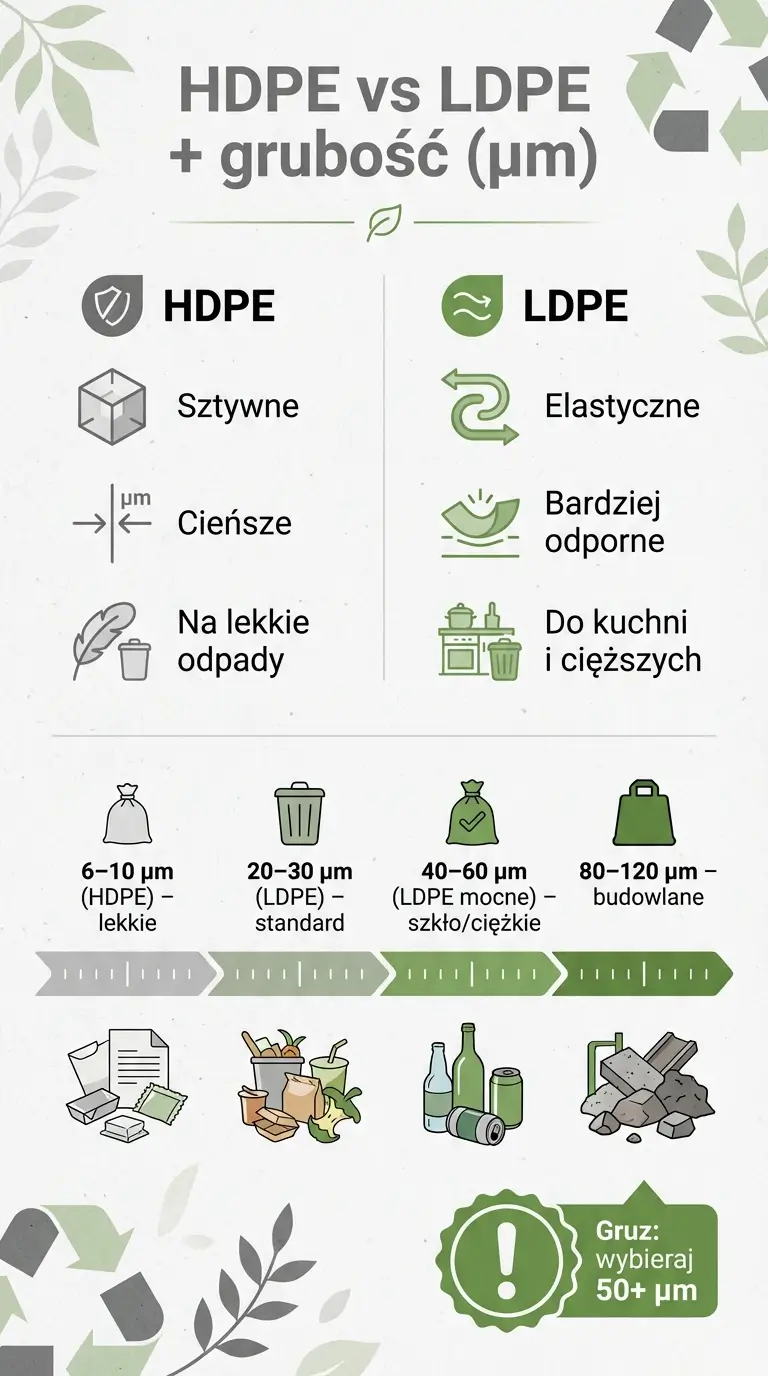 To, czy worek wytrzyma, zależy od jego grubości. Cieniutka folia 8–15 µm nadaje się tylko na papier czy lekki plastik w biurze, ale pamiętaj, że są różne rodzaje worków na śmieci. W kuchni potrzebujesz czegoś solidniejszego, więc wybierz foliowy worek o grubości 20–40 µm. Jeśli natomiast masz do wyniesienia odpady budowlane i ciężki gruz, szukaj worków foliowych powyżej 50 µm z wysoką odpornością na uszkodzenia. Worki na śmieci wykonane z ldpe są elastyczne i trudno je rozerwać, nawet gdy wrzucisz do środka ostre kości czy słoik. Z drugiej strony mamy worki hdpe – są sztywne i szeleszczące, więc zostaw je raczej na lekkie śmieci z łazienki. Bardzo polecam różne typy worków na śmieci, które można dostosować do potrzeb. Wytrzymałe worki na śmieci to produkty, które mogą pomieścić różne ilości odpadów. z taśmą ściągającą, bo dzięki nim możesz bezpiecznie przenosić odpadki do zsypu bez strachu, że coś wypadnie górą.