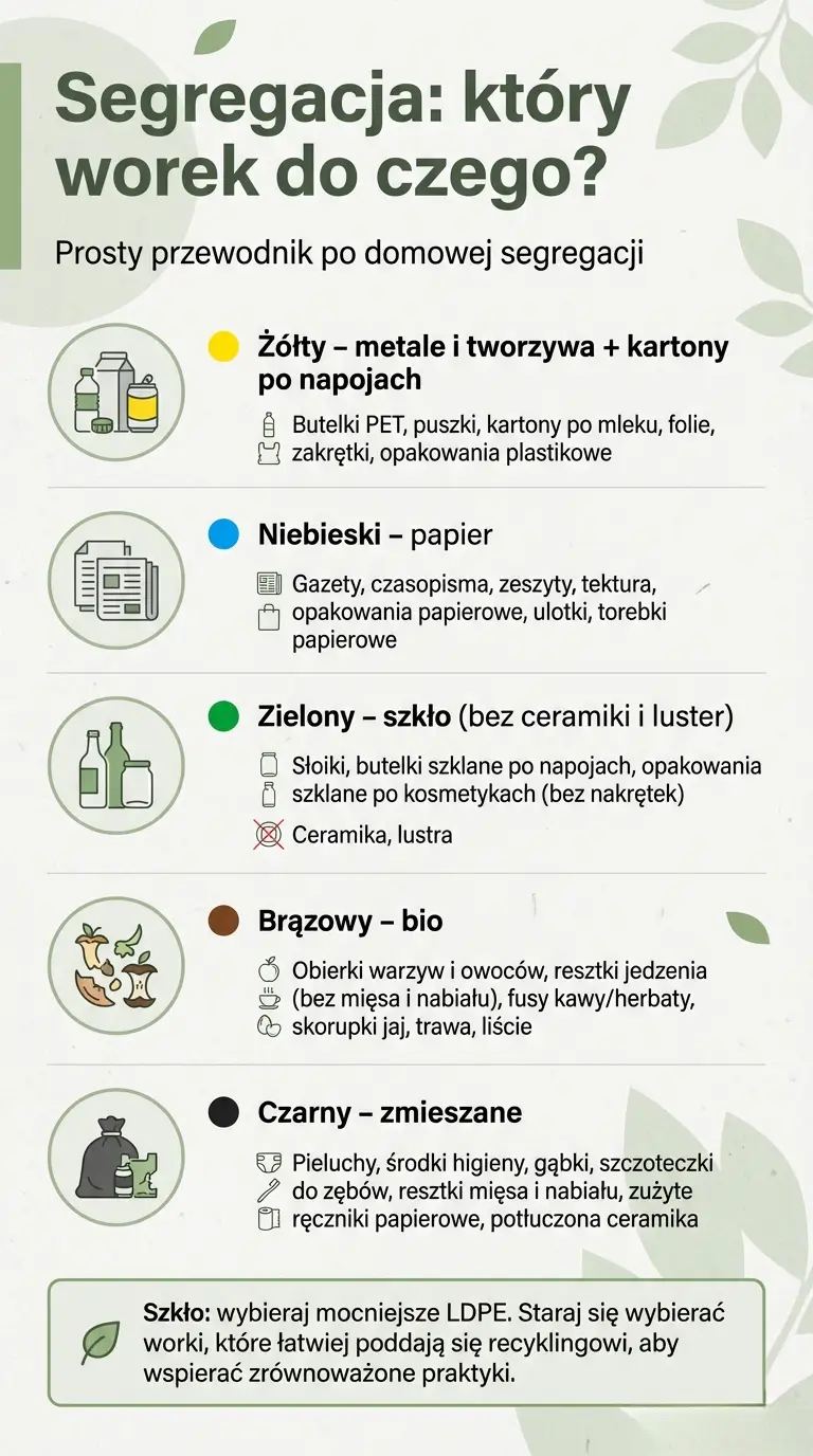Choć kolor worka wybierasz pod rodzaj odpadów, to Pojemność worków do segregacji śmieci powinna być dostosowana do ilości odpadów, które generujesz. dopasuj do tego, ile danej frakcji u Ciebie powstaje. Pamiętaj też, że worki muszą być mocne – zwłaszcza zielone worki na szkło, gdzie potrzebny jest gruby materiał ldpe, żeby butelki nie przebiły spodu.