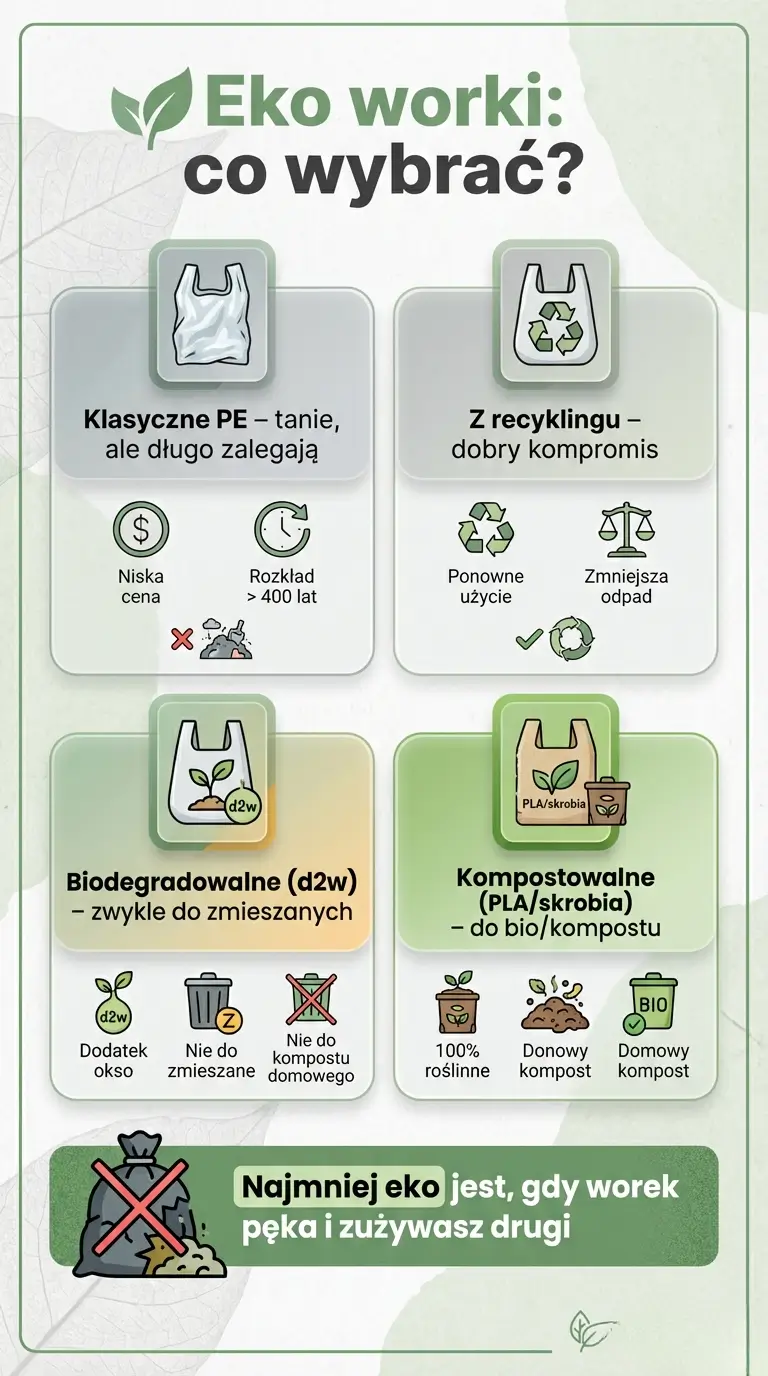 W sklepach mamy teraz sporo opcji proekologicznych. Klasyczne worki z polietylenu są tanie, ale zostaną na ziemi przez wieki. Jeśli chcesz być bardziej eko, wybierz ekologiczne worki na śmieci zrobione z recyklingu – to złoty środek. Biodegradowalne worki znikną w parę lat, a worki kompostowalne możesz wrzucić do kompostownika razem z obierkami. Coraz częściej przy produkcji worków wykorzystuje się surowce wtórne, co bardzo mnie cieszy. Moim zdaniem idealne worki na śmieci to takie, które po prostu trzymają zawartość i nie pękają, bo nie ma nic mniej ekologicznego niż sprzątanie rozlanych śmieci i zużywanie kolejnego worka.